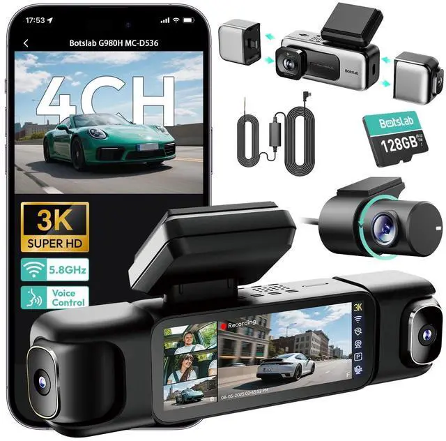 Collision Detection: Locks impact-triggered footage as permanent evidence. ^^ [Night Vision - F 1.8 Aperture] Dash cam front and inside with an F 1.8 aperture, 6-glass lens, 940nm infrared LED, and WDR technology. Captures sharp, balanced video in dark or high-contrast conditions. ^^ [BOTSLAB AI - Voice Control & 3.18" Touch Screen] This 3K 4 channel dash camera Hands-free operation via simple voice commands. The responsive touchscreen allows easy settings adjustment and features 4-way split-screen playbackview all camera angles simultaneously without switching. ^^ [Relive your Journey - Built-In GPS with AR Route Tracking] BOTSLAB dash cam features a built in high precision GPS module, accurately logs your vehicles location, speed, and route. Using [DVplayer] software on PC to create driving animations, or the BOTSLAB app for an AR view that overlays GPS data directly onto the video. ^^ [Fast Transfer - 5.8GH z Wi-Fi ] Dash cam download 4K footage to your phone 300% faster than with standard 2.4GH z Wi-Fi. Quickly save and share important clips in secondsno waiting. The car camera includes static-cling mounts (no adhesive residue) and a free 128GB SD card.