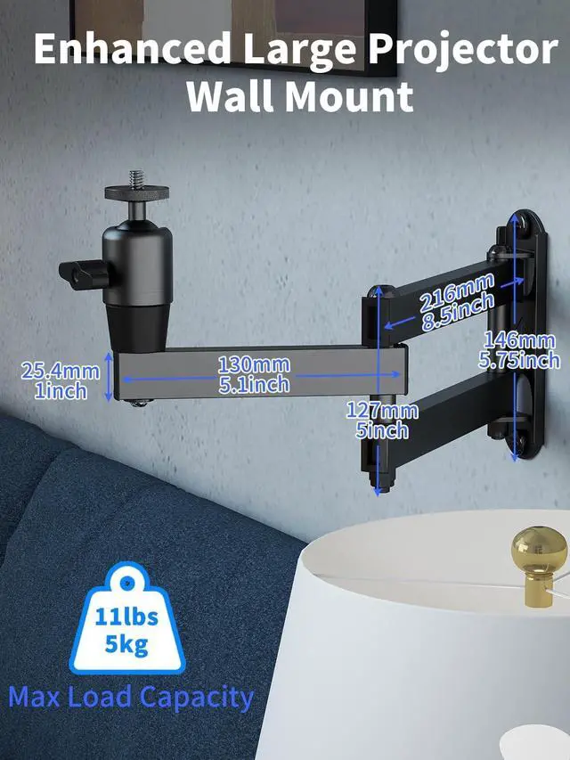 UNIVERSAL COMPATIBILITY Supports a wide range of projectors, digital cameras, camcorders, SLRs, and surveillance cameras with standard 1/4", M4, M6 screw mounts. Upgrate heavy-duty Crafted Joint can hold up to 11 lbs, making it ideal for most small to medium-sized projectors. ^^ QUICK & EASY INSTALLATION Comes with all necessary mounting hardware and step-by-step instructions for hassle-free setup. It is suitable for walls made of concrete, brick, or wood. Simply drill two holes in the wall, secure the bracket, attach the universal head, and