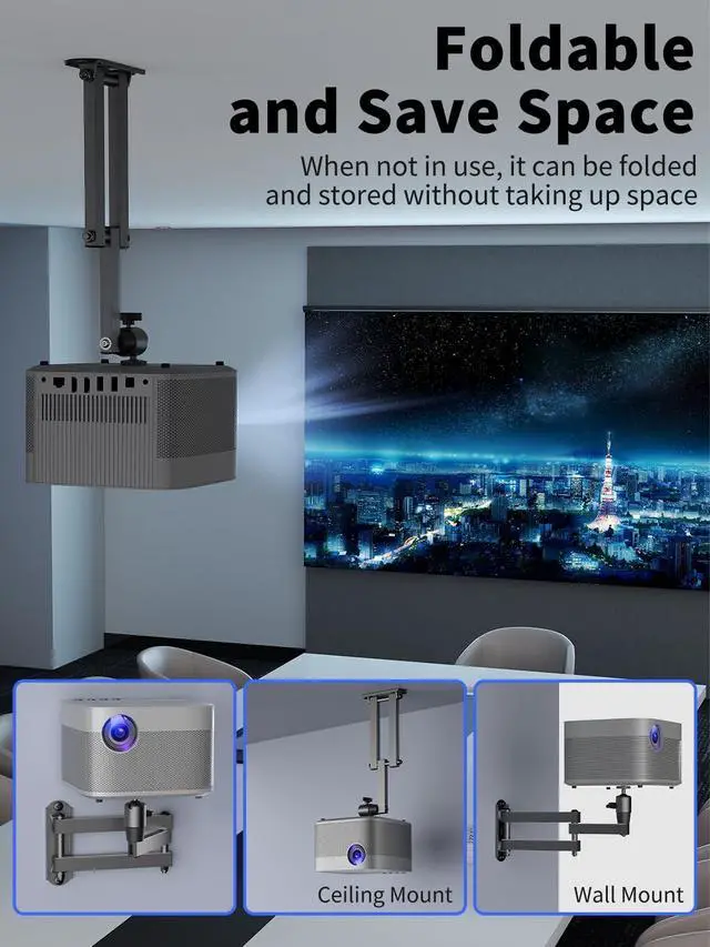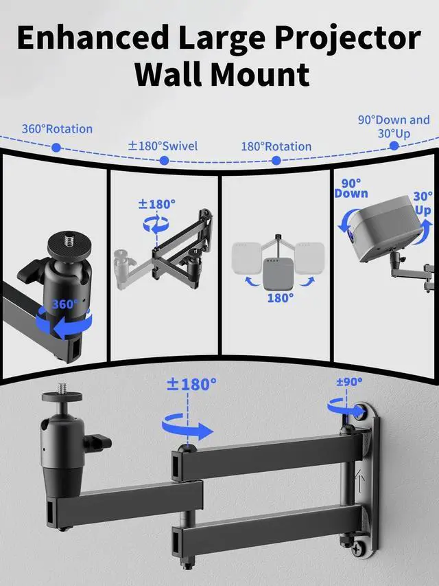 mount your projector (NOTE: Projector not included). ^^ FULLY ADJUSTABLE DESIGN Features a versatile articulating arm with 180 swivel and tilt, along with a 360 rotating head for precise positioning. Easily adjust the angle for the perfect viewing experience in any environment. ^^ FLEXIBLE POSITIONING The projector head tilts up to 30 up and 90 down, while the 360 rotation allows optimal placement for different setups. Perfect for home theaters, offices, classrooms, or security camera installations. ^^ COMPLETE PACKAGE & RELIABLE SUPPORT Includes 1x Projector Bracket, 1x Mounting Hardware Kit, and 1x User Manual.