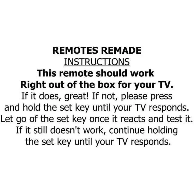 Works on arrival in most cases ^^ This universal remote usually works on arrival. If not simply hold the Set button till your TV Reacts and you are all set. This remote has the latest database of remotes so if you are in the market for a Universal TV remote, this is a good bet. ^^ Compatible with all brands of TV and all models of remote. ^^ Has the same functions as your original remote (Infrared functions only) ^^ Models its compatible with