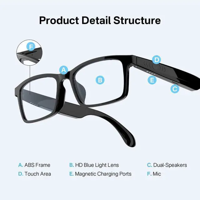 Protect Your EyesThese smart blue light blocking glasses are designed to reduce eye strain and improve sleep quality by filtering blue light from screens. The premium materials used minimize screen glare to help your eyes relax and increase focus. ^^ Seamless Audio ExperienceExperience an immersive audio experience with the industry-leading 60ms Bluetooth 5.3 connection. These premium glasses provide a stutter-free listening experience, making it easy to enjoy music or take calls without disruptions from audio delay or skipping. ^^ Effortless ControlManage calls, play/pause media, and activate voice assistants with a simple touch of the sleek interface.