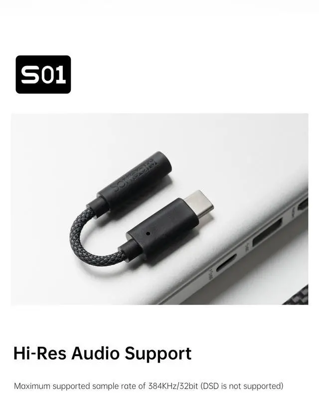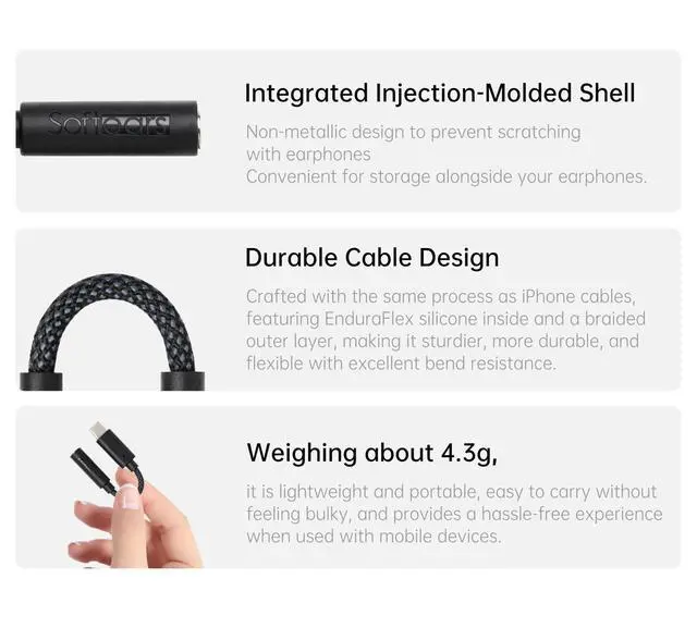 Portable USB DAC Type-C to 3.5 mm Durable and flexible design, ultra-low background noise. lightweight and portableEnduraFlex silicone + braided cable. scratch-resistant, break-resistant, and anti-twist. You can connect various devices with a standard 3.5 mm audio jack (such as earphones or speakers) to your USB-C device. ^^ Integrated Injection-Molded Shell Non-metallic design to prevent scratching with earphones. Convenient for storage alongside your earphones. ^^ Durable Cable Design Featuring EnduraFlex silicone inside and a braided outer layer, making it sturdier, more durable, and flexible with excellent bend resistance.