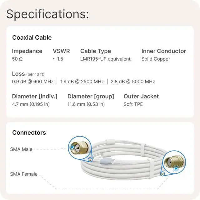 ^^ MODULAR AND EXPANDABLE: With SMA-Female connectors on one end and SMA-Male on the other, UltraFlex-Twin cables offer effortless modularity. This design makes it easy to link multiple cables together, achieving the perfect length for your unique setup.