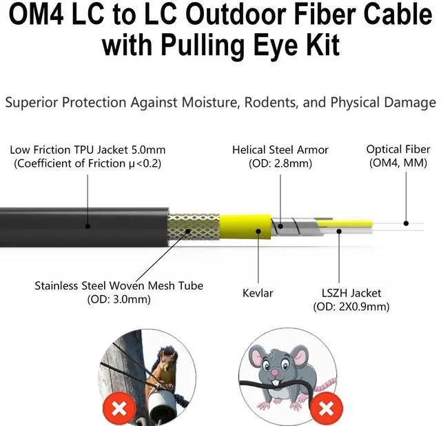 By using cable assemblies with LC Uniboot connectors, half of the space can be saved over traditional duplex cables. ^^ Pulling Eye Pre-Terminated OM4 Fiber cables--- with swivel pulling eye kit installed on one end to eliminate cable damage during installation to help you pull fiber cable through conduit. ^^ High-Speed Performance--- The OM4 LC to LC Industrial TPU outdoor fiber optic cable is specifically designed for high-speed data transmission, with the capability to support bandwidths of up to 100 Gbps. It offers versatile installation options, including overhead installation, direct burial in the ground, or routing through conduits.