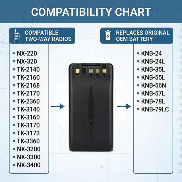 2000mAh High Capacity, Longer Battery Life Utilizes high-quality lithium-ion cells with a capacity of up to 2000mAh / 14.80W h and a voltage of 7.4V. Compared to ordinary batteries, it provides longer talk and working time, ensuring the walkie-talkie remains operational in scenarios such as wilderness exploration, security patrols, or construction, reducing the inconvenience of frequent charging. ^^ Wide Compatibility, Precise Replacement Manufactured strictly according to original dimensions ( 115.00 x 54.00 x 17.70 mm), perfectly compatible with Kenwood NX and TK series walkie-talkies. Directly replaces original models KNB-24, KNB-24L, KNB-35L, KNB-55L, KNB-56N, KNB-57L, KNB-78L, and KNB-79LC.