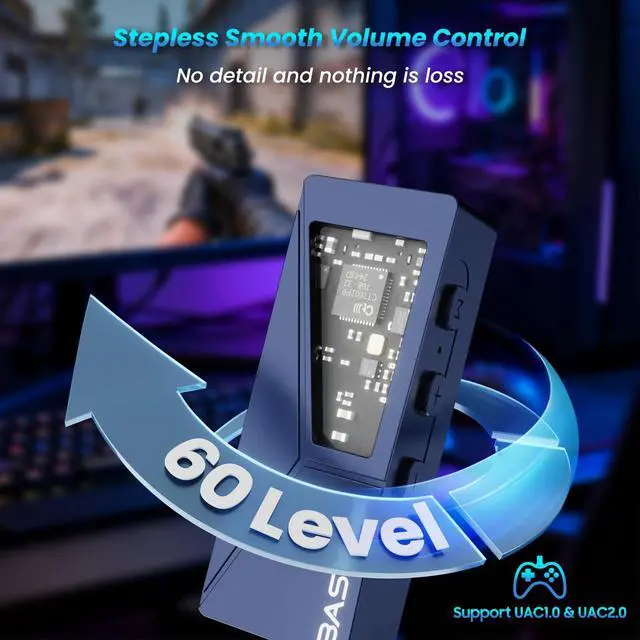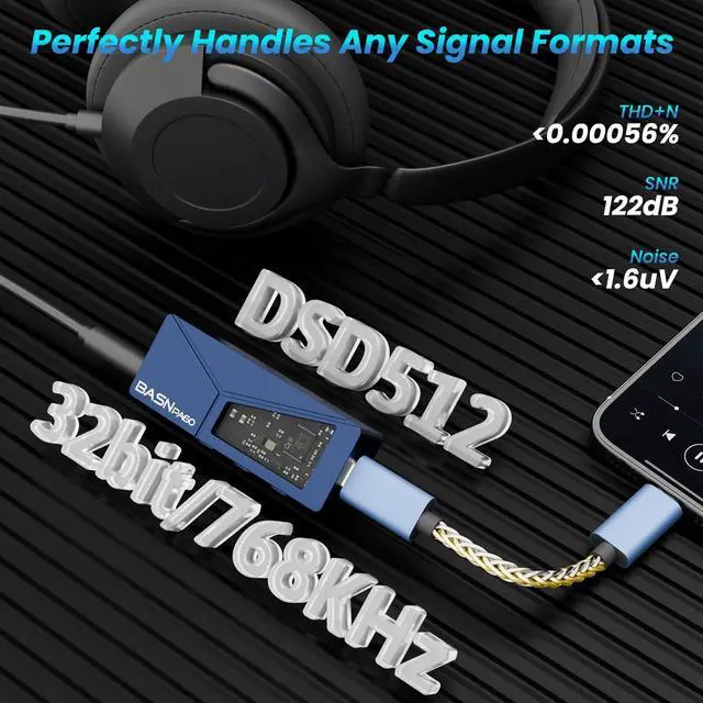 : Featuring the flagship ES9039Q2M decoding amplifier chip from ESS and the high-performance CT7601PR USB chip, the BASN PA60 portable DAC dongle delivers a clean, transparent sound signature with an exceptionally wide sound stage and precise instrument separation. This tiny headphone amp excels at reproducing smooth, delicate, and natural vocals, bringing your music to life with stunning clarity ^^: Housed in a compact design that includes 3.5 mm single-ended and 4.4 mm balanced dual outputs, this portable USB-C DAC supports headphones with different interfaces for enhanced sound quality and flexibility. With support sampling rates up to PCM 768kHz/32-bit and DSD512, the PA60 ensures your lossless music is reproduced with exceptional clarity and detail ^^: Take full control of your audio with a precise 60-step volume adjustment that operates independently of your source device. This allows you to push beyond the default volume limit while maintaining clear, uncompressed soundresolving issues like poor distance perception, background noise, and static. Easily switch between UAC 1.0 and 2.0 modes for broad compatibility with popular gaming consoles such as Switch and