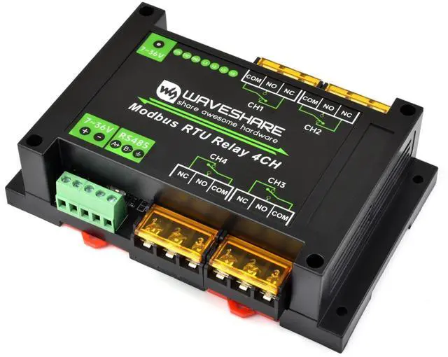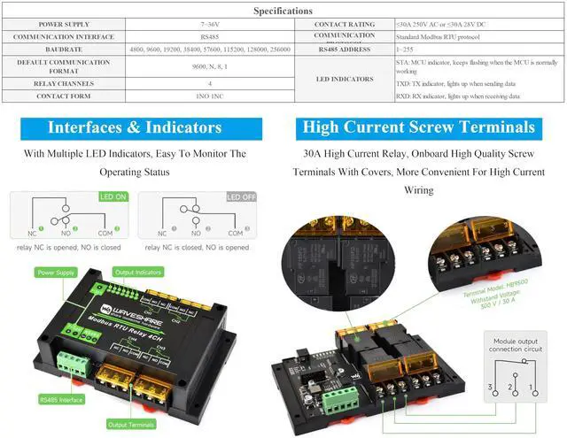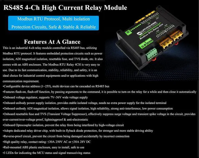 This is an industrial 4-ch relay module controlled via RS485 bus, utilizing Modbus RTU protocol. It features embedded protection circuits such as power isolation, ADI magnetical isolation, resettable fuse, and TVS diode, etc. It is an ideal choice for industrial control equipments and/or applications with high communication requirement. ^^ High Current Screw Terminals. 30A High quality relay, contact