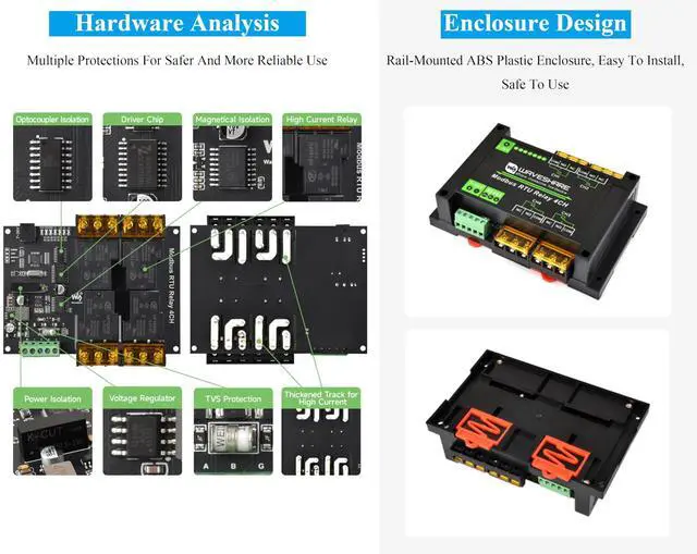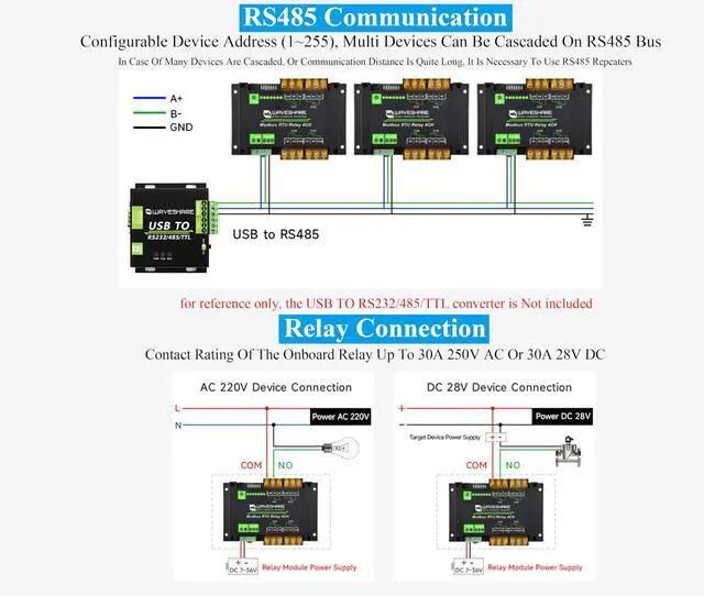 rating: 30A 250V AC or 30A 28V DC. Onboard high quality screw terminals with covers, more convenient for high current wiring. Configurable device address (1~255), multi devices can be cascaded on RS485 bus. ^^ Features flash-on, flash-off function, by passing arguments to the command, it is possible to turn on the relay for a while and then close it automatically. Onboard voltage regulator, supports 7V~36V wide voltage supply. ^^ Onboard unibody power supply isolation, provides stable isolated voltage, needs no extra power supply for the isolated terminal. Onboard unibody ADI magnetical isolation, allows signal isolation, high reliability, strong anti-interference, low power consumption. ^^ Comes with relevant resources and tutorials to help you get started quickly: bit. ly/4bQCfUO