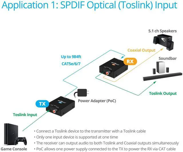 *Note: Good quality CAT cables are essential in delivering quality content ^^ DIGITAL HD AUDIO Supports Coaxial and Optical Toslink Digital Audio 5.1 -channel, Dolby Digital 5.1, DTS 5.1, DTS-HD, PCM ^^ AUDIO SPLITTER Simultaneously produce audio to both Coaxial and Optical Toslink outputs on the Receiver end.