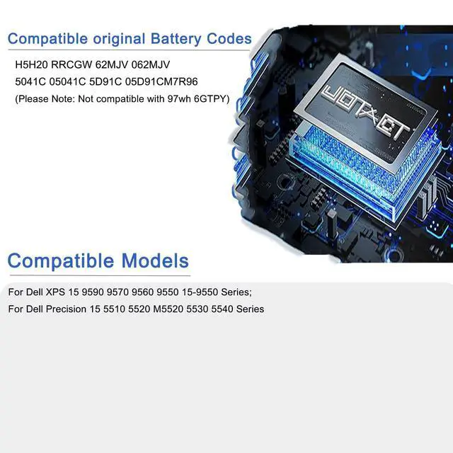 Note: Not compatible with 97wh 6GTPY) ^^ Compatible Laptop ModelsFor Dell XPS 15 9590 9570 9560 9550 15-9550 Series; For Dell Precision 15 5510 5520 M5520 5530 5540 Series ^^ High Safety 100% New, 100% Compatibility. Over-current protection, over-voltage protection, over-temperature protection, short-circuit protection, reserve protection, antistatic impact. Certified by CE/FCC/ROHS/UKCA