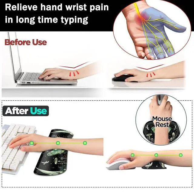 Providing good support to your wrist, maximum relieve wrist stress and tiredness. Ergonomic DesignThe curved and shape design of wrist support set fit perfectly on the wrist. The soft memory foamand filled cushion part will slowly bounce back when your hand leave it, not easy to out of shape. Providing good support to your wrist, maximum relieve wrist stress and tiredness.