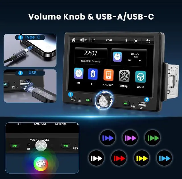 ^^ 7-Color Adjustable Backlight and USB-C/USB-A InputThis single din car radio features 7-color adjustable backlight to match your car interior and mood, along with USB-C and USB-A inputs for easy music playback, charging, and device connectivity, enhancing both style and convenience. ^^ HD 12LED Backup CameraThis package comes with an HD 12LED backup camera, featuring 720p resolution, IP68 waterproof rating, and night vision capability. Provides clear and reliable rear view assistance for safer parking and reversing in any weather or lighting conditions.
