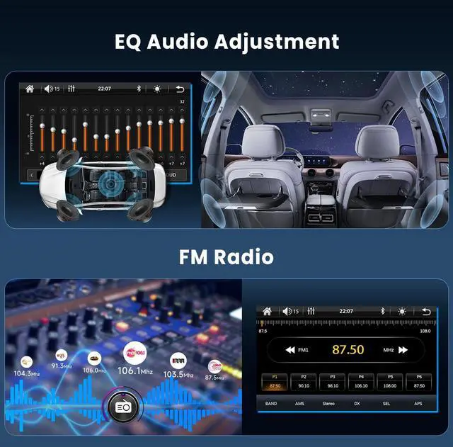 ^^ Bluetooth Hands-free Calling and FM RadioThis single din touchscreen car stereo supports Bluetooth hands-free calling for safe communication while driving, along with FM radio and RDS function to provide clear reception and display station information, making every drive more enjoyable and convenient. ^^ Steering Wheel Control and EQ Audio AdjustmentThis 1 din carplay radio supports steering wheel control for easy, safe operation while driving(please pair buttons and functions first in Settings-Steering Learn), and features built-in EQ and DSP audio adjustment to customize sound output for clearer vocals, deeper bass, and a balanced listening experience.