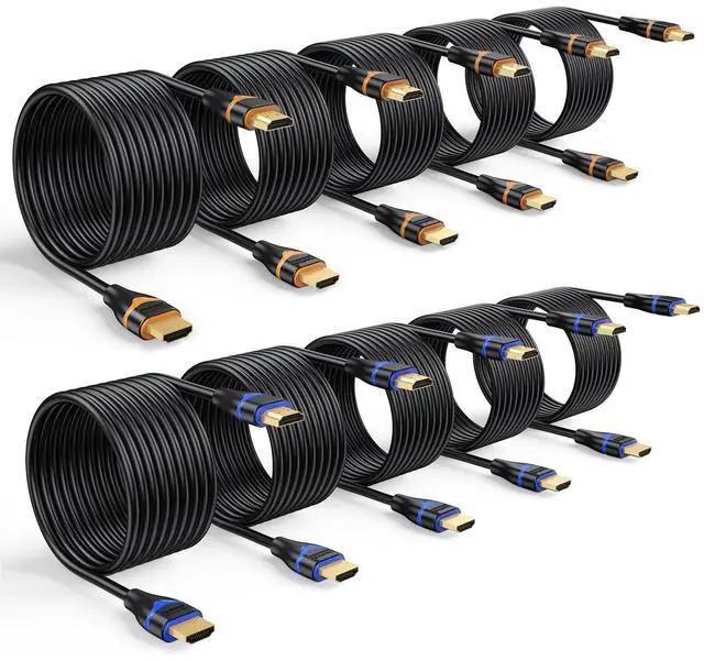 4K HDMI Cable 15FT 10-PackHigh Speed HDMI Cable Supports 4K Video @60Hz, Backward compatible with 2K 1440P@144Hz/@120Hz/@60Hz, Full HD 1080P@120Hz, and HD 720P. Also supports HDR, Audio Return Channel (ARC), Dolby TrueHD 7.1 audio, HDMI Ethernet Channel (HEC), 3D video. You can enjoy Ultra-high-definition audio-visual experience ^^ Upgrade Design, Blue and OrangeYou will get blue and orange hdmi cables. HDMI Cord has 24K gold-plated connectors, 28AWG copper wire, triple tin shielded, with a new smart IC chip, so that the ensuring stable signal transmission and more durable.