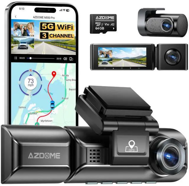 Dash Cam: AZDOME M550 Pro 3CH Dash Cam 4K with 5G WiFi, 3.19" Screen IR Night Vision and 24H Parking Mode records front, rear, and cabin footage simultaneously with a multifunctional camera ^^