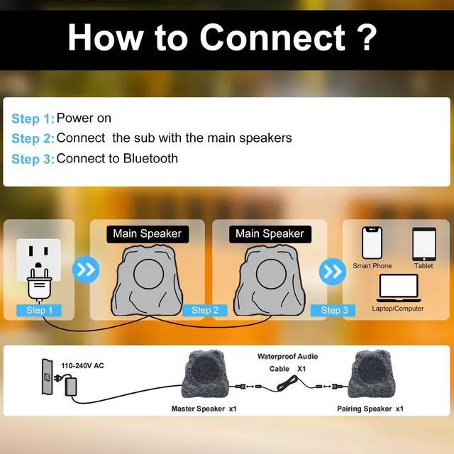 Install: Simply splice the Master Speaker needs to be located near an AC outlet. Easily connect 2 outdoor bluetooth speakers via a single device and touch device "Bluetooth" for automatic connection Play Music via Bluetooth Device and Enjoy.
