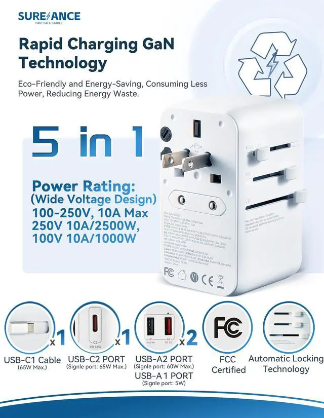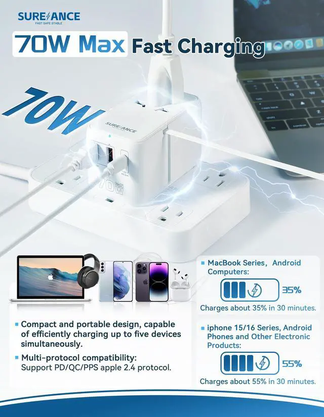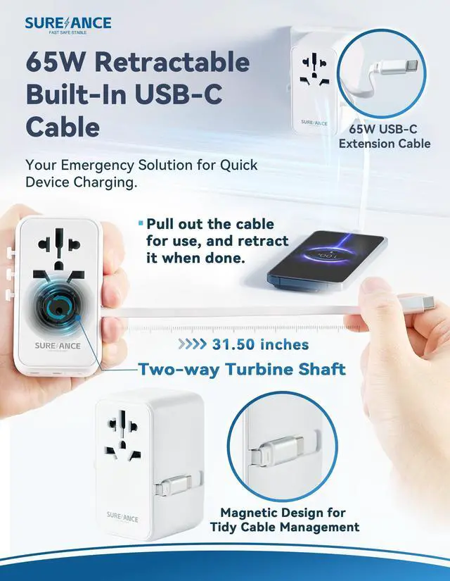 5-in-1 GaN 70W Max Universal Travel AdapterThe charger adapter with an output power of up to 70W, featuring an upgraded 65W retractable USB-C cable, 1 USB-C PD (65W Max) and 2 USB-A QC (60W Max) fast charging ports, and one universal AC outlet. This international power adapter meets all your charging needs while traveling worldwide. Charges up to five devices at once, delivering 35% power for MacBook and Android laptops and 55% for iPhone 15/16 and other devices in just 30 minutes ^^ Retractable 65W Fast Charging USB C Cable Travel Plug AdapterTwo-way turbine shaft, simply pull out the cable to use it, allowing for flexible adjustment to the desired position for charging based on your needs.