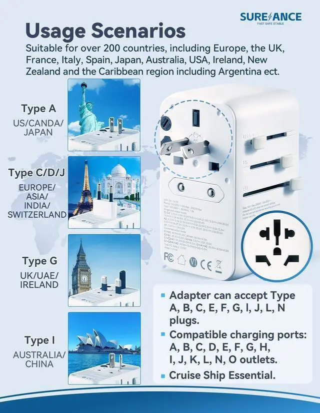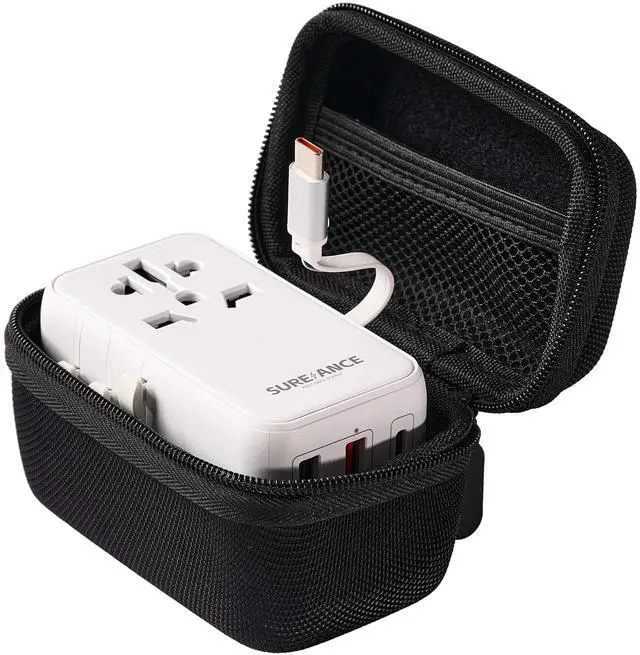 After use, just give it a gentle pull, and the fast charging cable will automatically retract. The side features a magnetic design, ensuring a neater and more aesthetically pleasing cable placement ^^ Worldwide Capability Travel AdapterTravel power adapter universal covers 200 countries: Type C - France, Germany, Italy, Spain, Iceland, Greece, Israel; Type G - UK, Ireland, London, England, Scotland, Dubai; Type I - China, Australia, New Zealand, India; Type A - USA, Japan, Canada, and more. This versatile plug adapter serves as a European plug adapter, US to Japan plug adapter, US to UK plug adapter etc, making it perfect for global traveling ^^ Travel Essentials EVA BoxProtect your essentials with durable, water-resistant EVA material that cushions against impacts and scratches, this universal travel adapter with usb c is best gifts for people who travel, study, work or daily use. The dimensions are 1.96 x 2.1 x 3.54 inches, and it weighs 0.827 pounds ^^ Not Travel Power Adapter ConverterOne plug meets all your travel charging needs, compatible with various devices including fans, power banks, kettles, toothbrush, cameras, hair dryers (under 2500W), laptops, smartphones, and more; please note this travel adaptor worldwide does not convert voltage and has a power rating of 100-250V, 10A max for a total of 1000W-2500W, so confirm your voltage before use ^^ 8 Safety Protection Travel Adapter USB CThis travel accessory offers protection against overcharge, overload, temperature, overvoltage, short circuits, overcurrent, low voltage, and chip issues.