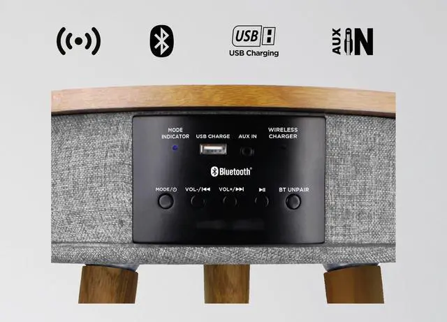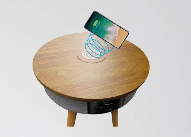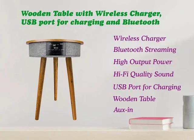 Wooden Table with Wireless Charger, High Power Output Hi-Fi Quality Sound, USB Port for Charging, Bluetooth, Aux-in, AC Power Operation only, AC Adapter included.