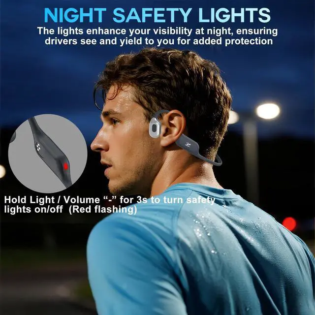 Running Headphone with Night Safety Lights: Indicator lights are integrated on both sides of this bone conduction headset. Press and hold the Light/Volume'-' button both for three seconds to activate or