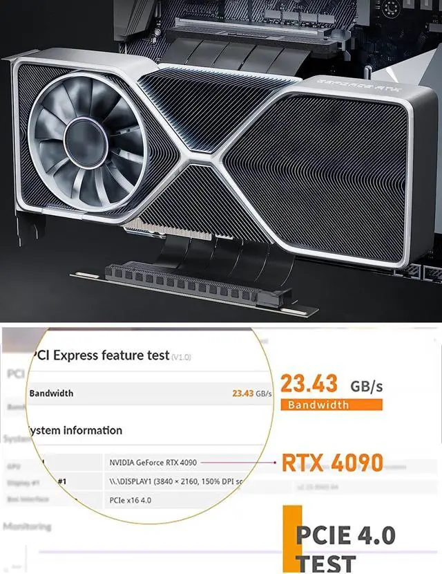 PCIe 4.0 16X Flex extension cable alow PCI-e GPU graphic card in any direction on suitable position ^^ PCI-E 4.0 X16 full speed bandwidth (back compatible with PCI-E 3.0 / 2.0 / 1.0 ), and compatible with X1/X4/X8/X16 PCIE Host cards ^^ Foiled cable for High-frequency impedance and EMI design ^^ Golden plated contacts for best connectivity and long lifeGolden plated contacts for best connectivity and long life ^^ Compatible with most GPU/motherboard components and fits most cases. Supports PCIE 4.0 / 3.0 / 2.0 / 1.0, compatible with RTX4090 and all gen 4 GPUs, RTX3090ti, RTX3090, RTX3080ti, RTX3080, RTX3070ti, RTX3070, RTX3060ti, RTX3060, RX6950XT, RX6900XT, RX6800XT, RX6800, RX6700XT, RX6600XT, RX6500XT / Chipset - x570, B550, Z590, Z690