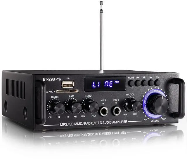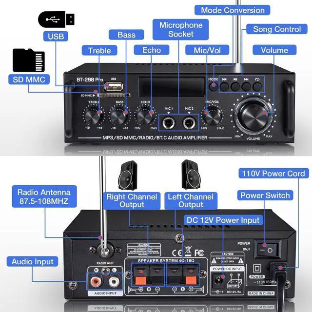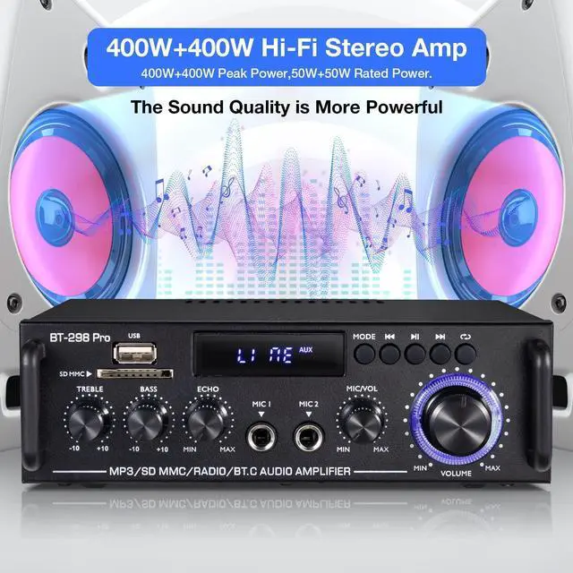 Powerful Sound in a Compact Size-- Enjoy clear and clean sound with RMS 50Wx2/ MAX 400Wx2 stereo effect from this small BT amplifier. (2024 UPGRADE VERSION) Which is perfect for karaoke, home theater, and acoustic sound systems. It's great for small apartments, bedrooms, offices, basements, and garages. Its compact size design fits easily into your bookshelf or A/V cabinets. ^^ Multiple Input Options-- Connect your music streaming devices like pc/mobile/laptop with Bluetooth, RCA & MIC Input. It also supports USB Port, SD/TF Card port. Just enjoy your music the way you want to.