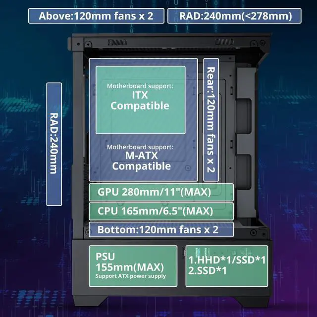 LINEDEPOT has really organized the inside of this Gaming PC Case MATX well. The installation spots are cleverly designed, ensuring no problems when installing powerful hardware. Gamers can fully enjoy building their setups as they please. It's compatible with most popular hardware, supporting 280mm (11") GPUs, 165mm tall CPU coolers, a 240mm liquid radiator on top, and 155mm (6.1") power supplies.