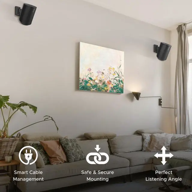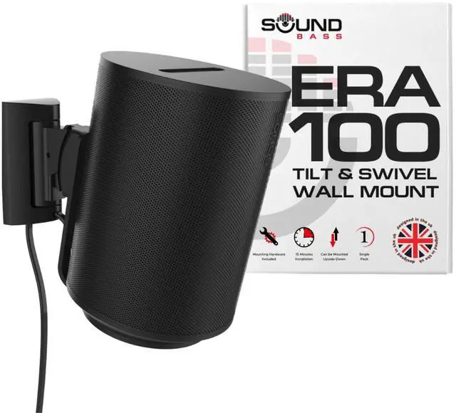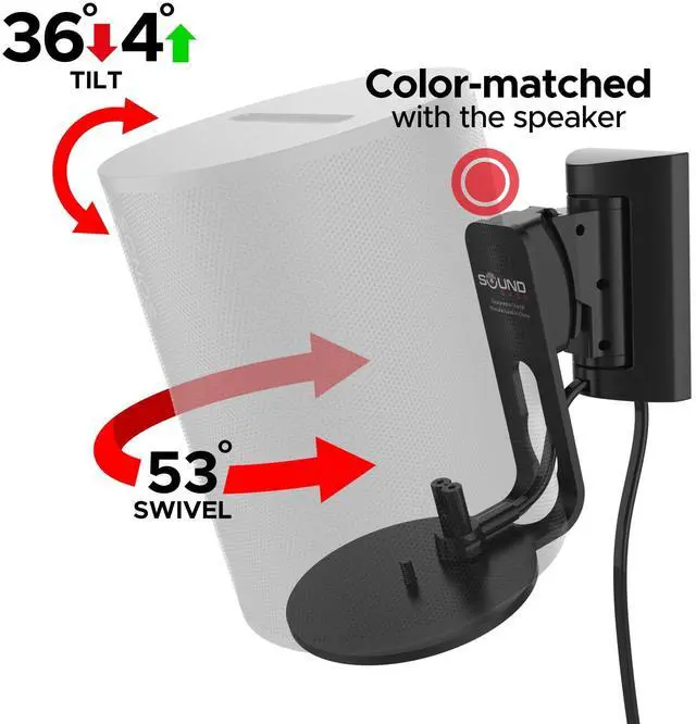 TILT AND SWIVEL FOR CUSTOMIZED AUDIO: Experience complete control over your listening experience with our mount's wide swivel range of 53 left/right (wall to wall) and tilt 36 down / 4 up. Easy, tool-free adjustments allow for personalized audio positioning, ensuring the best sound quality in any room setup. Compatible with Sonos ERA 100 & ERA 100 SL.