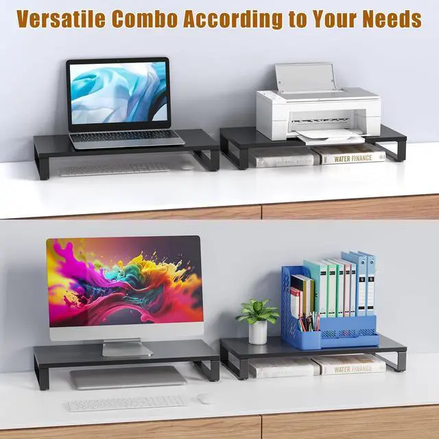 Multifunctional Shelf for Any SetupUse this versatile computer monitor stand as a monitor/laptop/printer riser, TV box holder, game console platform, TV riser stand, or keyboard storage. Perfect for home and office setups. ^^ Spacious & Stylish Wood SurfaceRustic brown wood surface (24" x 12") is smooth, wide, and stylishenough to hold your monitor, laptop, and docking station. A monitor stand riser that combines durability with modern aesthetics. ^^ Strong & Sturdy ConstructionThickened steel frame supports up to 40 lbs, keeping your monitor and accessories stable. Non-slip pads protect your desk surface.