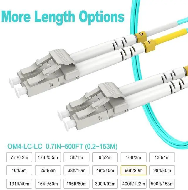 20m/65ft OM4 LC-LC Fiber Patch Cable RamboCables OM4 20m/65ft LC to LC fiber patch cable multimode duplex has a 50/125m high rated fiber cladding, 850/1300nm Wavelength, 2.0 mm fiber cable diameter and environmentally friendly LSZH fiber jacket. This high quality 50/125m OM4 multimode LC to LC fiber patch cables ensure a more stable and efficient network for you. ^^ Wide UsageOM4 MMF is the preferred fiber specification for 40G Ethernet connections. OM4 LC to LC Multimode Duplex Fiber patch cords is specially designed for connecting 10G SR, 40G BIDI SR, QSFP+, SFP+ transceivers etc, ideal for 10G/40G/100G Ethernet connections.