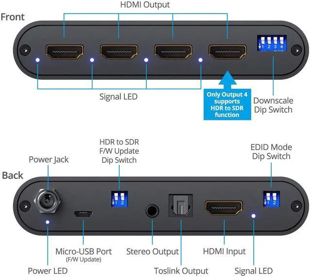 YUV 4:2: 2 to 1080p ^^ ADVANCED EDID MANAGEMENT 8 comprehensive EDID settings, including presets, EDID learning, and AVR mode. Simultaneously connect your HDMI 2.0 4K TV and HDMI 1.4 AVR for the best video experience with an older AVR. The default EDID setting (U/U/U/U) works for most situations, including 4K to 1080p downscaling. Atmos is supported via AVR EDID mode (U/d/d/U). Firmware upgradable. Contact us if youre unsure which EDID to use ^^ HIGH QUALITY COMPONENTS & LOW HEAT GENERATION Made in Taiwan. Sturdy metal enclosure provides durability and minimizes EMI/RFI noise interference. Low heat generation and ESD protection to guarantee the highest stability. FCC, CE & RoHS compliant. Our products are backed with a 1-year limited warranty and experienced tech support team in Silicon Valley. Please click on gofanco in the buy box and select Ask a Question if you have any questions or concerns.