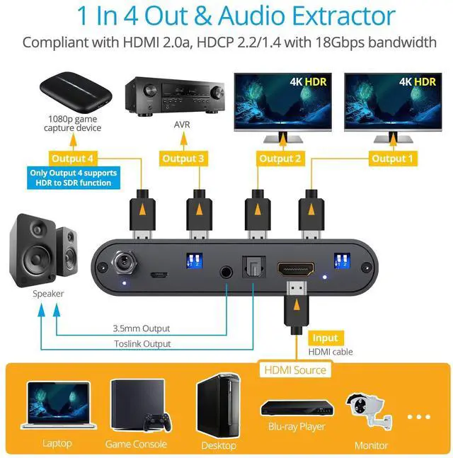 *Note: Limit HDMI cable length to no more than 10m ( 32.8 ft). Contact us before purchasing if you are not sure about compatibility ^^ 4K HDR VIDEO & AUDIO Supports up to 4K @60Hz ( 4:4: 4 8-bit), HDR at 4K @60Hz ( 4:2: 0 10-bit), 3D, Deep Color. Supports 7.1 / 5.1 / 2.1 -ch audio, and the latest HDMI digital audio formats. Atmos is supported via AVR mode ^^ AUTO VIDEO DOWNSCALING Supports mixed 4K & 1080p display outputs. A 4K video source device can simultaneously display 4K content to 4K monitor (s) and 1080p content to 1080p monitor (s) via downscaling. Does NOT support mixed 2K & 1080p outputs. Use Elgato or other game capture device to record game play footage in 1080p, while actually playing in 4K.