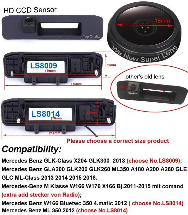 The difference in size between the two cameras: LS8009 = 52mm*175mm/150mm LS8014 = 52mm*214mm/170mmThis product could fit all of the following models as expected: Replacement for Mercedes Benz GLK-Class X204 GLK300 2013 (choose NO. LS8009); Replacement for Mercedes Benz GLA200 GLK200 GLK260 ML350 A180 A200 A260 GLE GLC ML-Class 2013 2014 2015 2016Replacement for Mercedes-Benz M Klasse W166 W176 X166 Bj. 2011-2015 mit comand (extra add stecker von Radio); Replacement for Mercedes Benz W166 Bluetwc 350 4. matic 2012 ( choose NO. LS8014)Since the same car model may have differences in different countries, please check the camera size and compare your car's installation carefully to avoid mistakes.