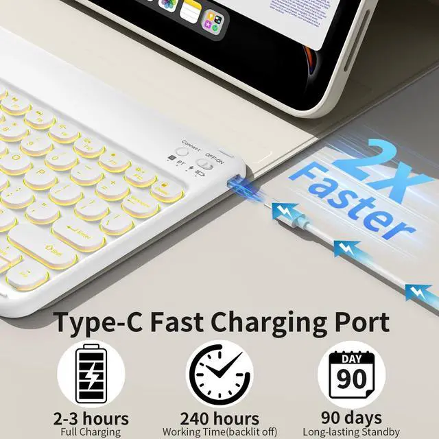 ^^ Long Life Battery Rechargeable KeyboardiPad keyboard Built-in powerful 420mAh battery and enters energy-saving mode automatically if not in use for 15 minutes, which worry-free use and long standby time. Using a Type-C charging port of keyboard charges faster, only 2-3 hours full charge.