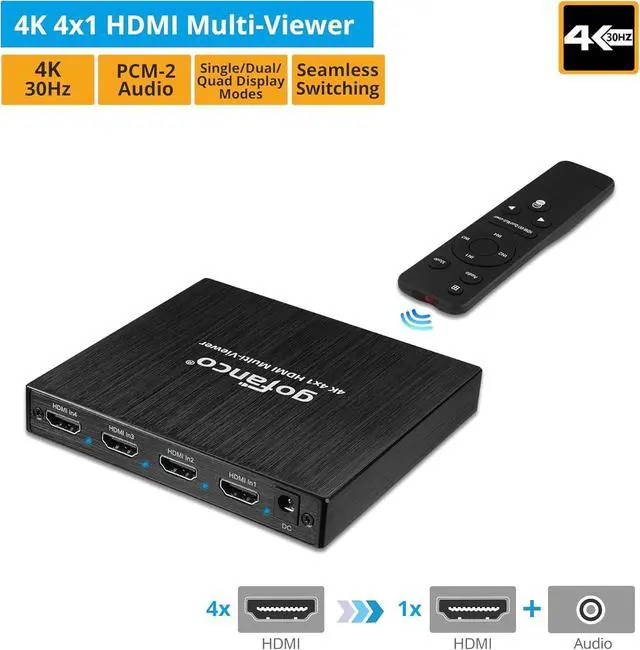 gofanco 4K HDMI Multi Viewer 4 in 1 Out View 4 HDMI Sources on One Screen, Quad/Dual/Single Modes, Seamless Switching, IR Remote, for Workstations, Monitoring & Streaming (QuadView4K)