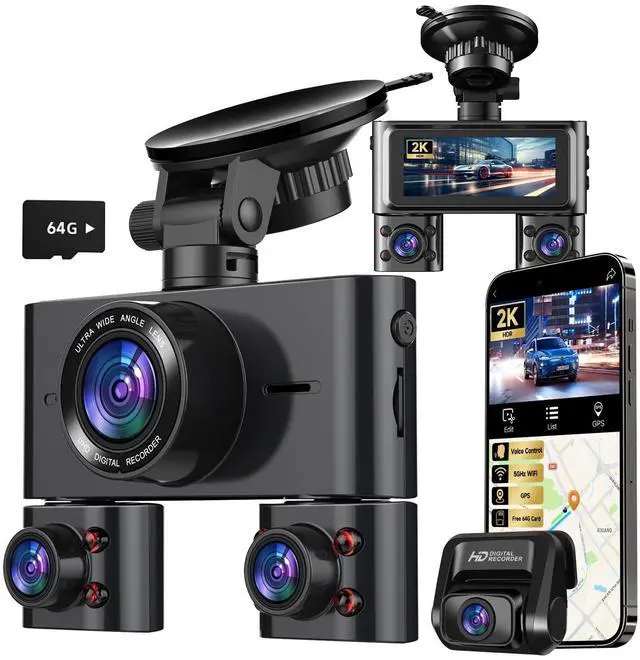 Which offering 2 movie modes: 4K front+1080P rear, or 2K front+1080Px3 left, right and rear resolutions. Left and right videos are stitched together into one frame for easy viewing. The excellent resolution of the dash cam front and rear seamlessly captures every detail ^^ Loop Recording & G-Sensor DashcamThe driving recorder comes with a 64GB SD card (maximum support 256GB). Every 3min loop recording, the oldest videos will be overwritten when the SD card is full. Built-in sensitivity G-sensor can automatically detects a sudden shake/collision and locks the footage to prevent the video from being overwrote even in loop recording ^^ 24 Hours Parking Mode Dash Camera for CarThe parked car security camera will automatically switch to parking mode when you stop and turn off, the car surveillance camera 24/7 recording parking mode. The dash cam for cars has time-delay recording function, which can record continuously with low power consumption and low frame rate, providing 360 protection for your car. To realize this feature, you need to connect the hardwire kit which separately purchased