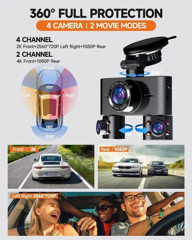 4 Channel 360 Dash Cam (Upgraded Version) HUPEJOS V7PLUS Mini Dash Cam will provide you with 150*4 super wide-angle field of view, left and right cameras can be rotated to adjust the angle to ensure 360 all-around protection.