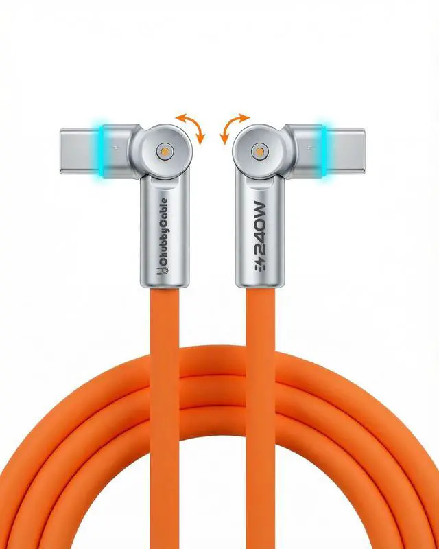 chubbycable Chubby RotateX 240W Dual 180 Rotating Fast Charging Cable with LED Light Soft Silicone USB C Cable Extra Thick Durable Charger Cord, Orange, 6.6ft
