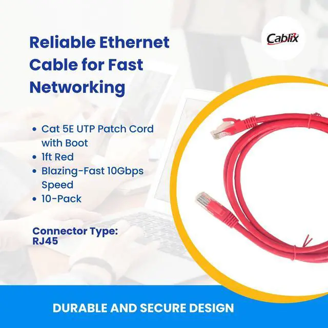 Cablix Cat 5E UTP Patch Cord with Boot, 1ft, Red, 10-Pack Reliable Ethernet Cable for Fast Networking & Internet Connections