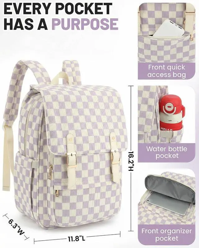 Women: The roomy main compartment fits most 15.6 -inch laptops, tablets, and chargers. Under the flip cover, front pockets fit pens, earbuds, or wireless mice perfectly. Two side elastic pockets securely hold water bottles, umbrellas, or travel mugs. A hidden anti-theft back pocket adds extra protection for passports, credit cards, and cashideal for daily commutes, college, or travel.