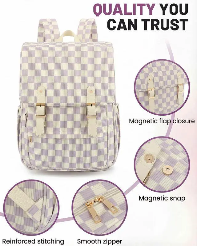 Corduroy Material: This corduroy laptop backpack is crafted from high-quality corduroy fabric, featuring a soft, skin-friendly texture that feels comfortable against your skin. All seams are reinforced with neat stitching for enhanced durability, making it sturdy enough to withstand daily use for school, commutes, or outings.