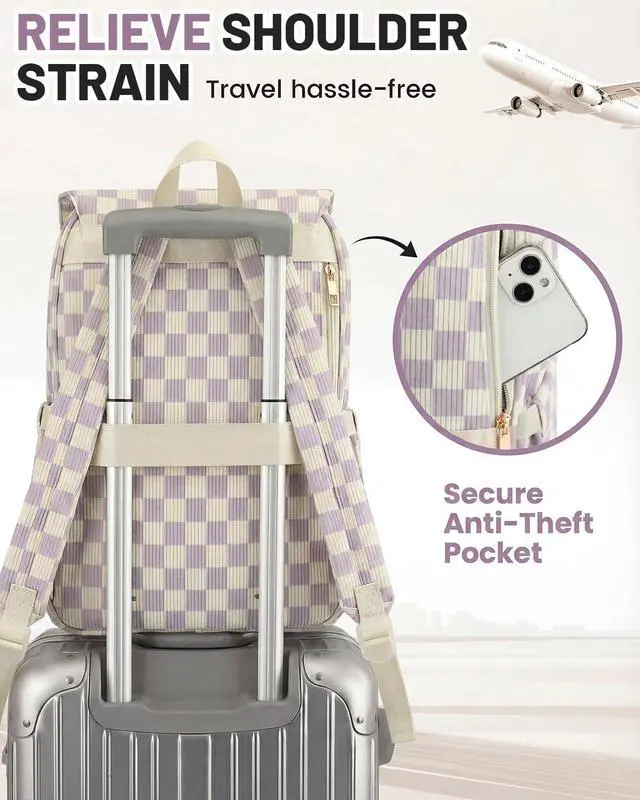 ^^ Comfort and Convenience: The shoulder straps of this womens corduroy backpack are filled with thick foam padding, offering a soft touch while evenly distributing weight to reduce shoulder strainideal for all-day. Additionally, the built-in luggage strap on the back easily slides over suitcase handles, freeing up your hands and making travel, business trips, or commutes more convenient and comfortable.