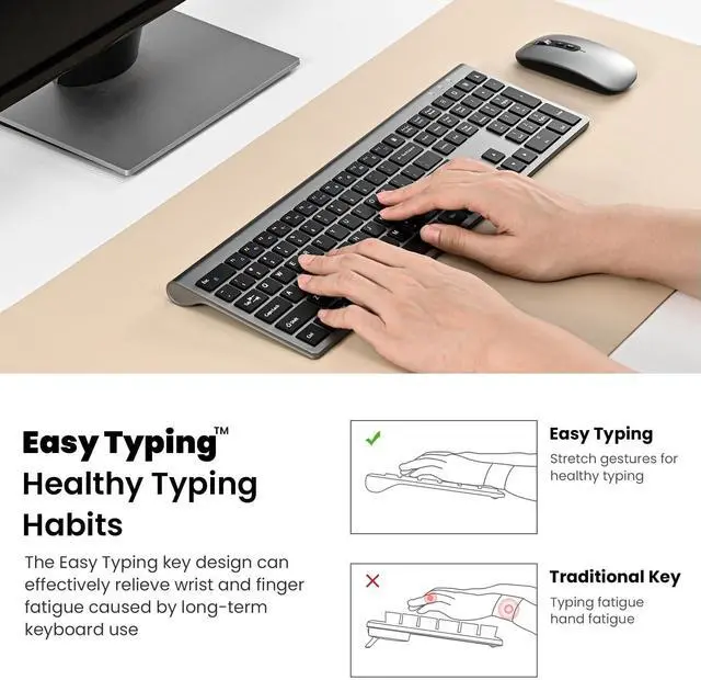 Wireless World is More FreeDistance is no longer a problem, stable and reliable 2.4G wireless technology connection, up to 10 meters of control distance to relieve wired constraints and enjoy wireless life smoothly ^^ Scissor Switch Key is More ComfortableThe keyboard adopts a scissor Switch Key design, Uniform force distribution, low sound, short travel, and smooth pressing provide a comfortable and quiet input experience ^^ Rebound is More EffortlessAccurate and fast typing without delay, rebound smoothly and evenly, fast response to hand tapping feedback for long-lasting typing without wrist fatigue.