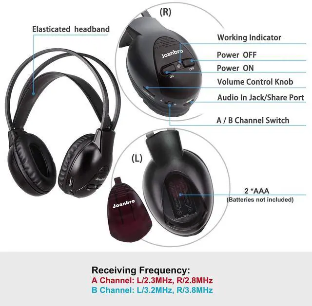 NOTE: 1. DO NOT SUPPORT DIGITAL IR system. 2. Be sure that users are sitting in the rear seat of the vehicle with a clear line-of-sight to the DVD player. (Refer the Vehicle Compatibility Chart-Ref. FIG 2 or Product Description) ^^ IR Car DVD Headphones for Chrysler Town & Country 2006 2007 2008 2009 2010 2011 2012 2013 2014 2015 2016 2017 2018 (work on 2013-2018 BLURAY (NOT DVD) system), Chrysler Pacifica 2002 2003 2004 2005 2006 2007 2008 2009 2010 2011 2012 2013 2014 2015 2016 (Compatible 2017-2021 Chrysler Pacifica Ceiling Mounted Screens. NOT COMPATIBLE with Pacifica Dual Seatback Screens). And these Wireless IR Headphones also have a headphone jack and a 1.5 m AUX cord to use on any device with a standard 3.5 mm port. ^^ Joanbro IR replacement DVD headphones work with Chevy Traverse 2002 2003 2004 2005 2006 2007 2008 2009 2010 2011 2012 2013 2014 2015 2016 2017 2018 2019 2020, Chevy Suburban 2002 2003 2004 2005 2006 2007 2008 2009 2010 2011 2012 2013 2014 2015 2016. These Infrared headsets use 2 AAA Alkaline batteries (not included) when used wireless, no batteries required when used with the aux cord feature.