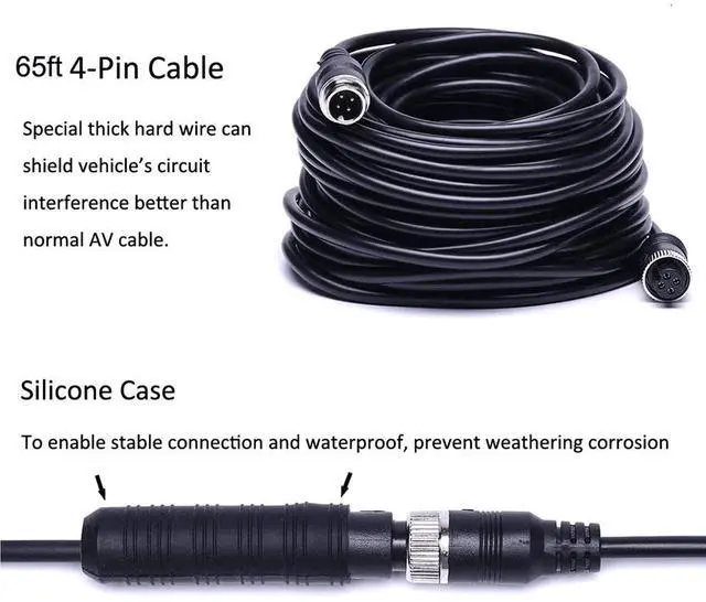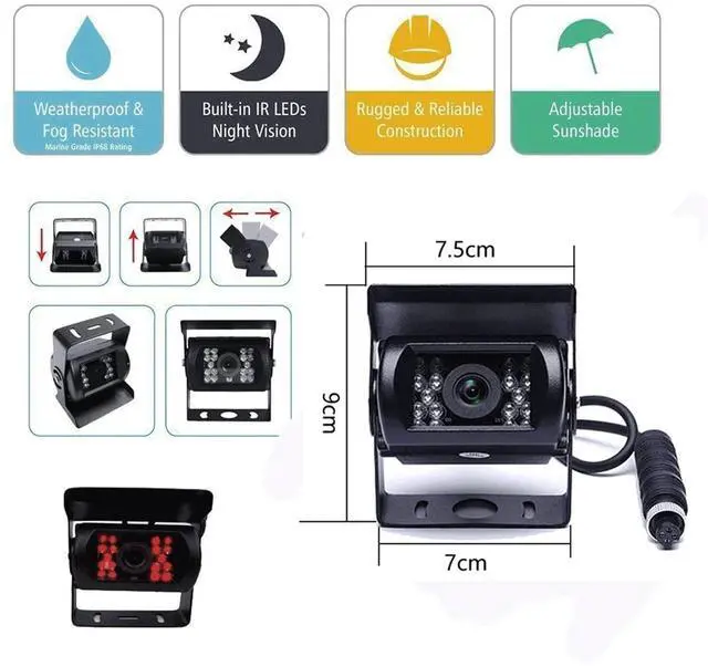 18 IR LEDs for Night Vision + 120 horizontal wide view angle + 180vertical adjustable angle to view the blind spots. You can get it work Full Time when connect to constant power source ^^ Backup Camera Kit With Extended Aviation 4 Pins Connector CordStrong anti-interference, more close connection, easy to install. Special thick hardwire can shield vehicles circuit interference better than normal AV cable ^^ Reverse Camera Monitor With Wide ComatabilityVoltage Range From 12-24V DC Power to Accomodate a Wide Variety of Large Vehicle as Truck, Bus, RV, Tractor, Car and ect