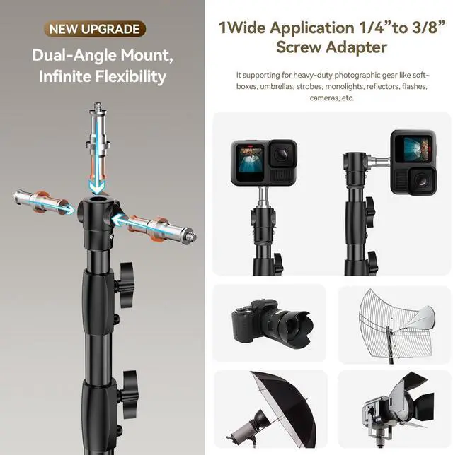 ^^ Wide Application: This photography tripod stand with 1/4 and 3/8reversible screw adapter is compatible with DSL