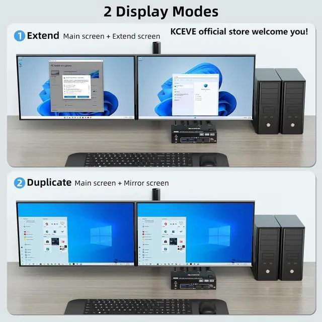 HDMI + DP Port KVM SwitchThis is a perfect 2 monitors KVM switch for DP and HDMI ports device to share keyboard mouse and monitor. When in copy mode the main screen can be copied to the second output screen. When in extend mode, the window from the main screen can be dragged to the second output screen. ^^ Support 2 Switching ModeThis 2 monitors 2 computers KVM switch support physical button and wired control. The wired control is upgraded, it's size is bigger and touch feel is more comfortable. By using the wired control you can hide the kvm switch under the table and keep the desk tidy.