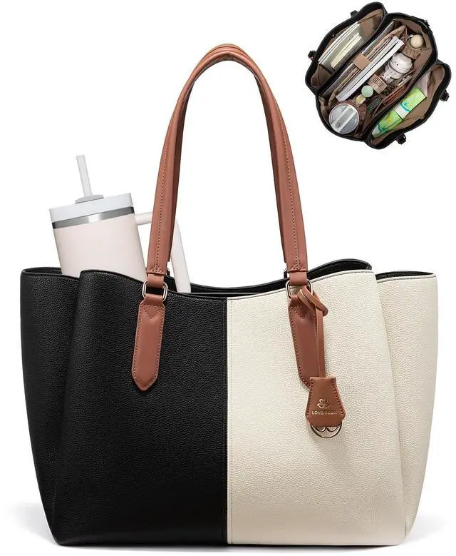 ORGANIZED TRIPLE COMPARTMENTS & SELF-STANDING Stop digging through a single disorganized space. Our laptop tote features a unique 3-layer structure with 2 magnetic side pockets and a central zippered laptop sleeve. The reinforced bottom-shaped design ensures the bag stands upright even when fully loaded, maintaining its elegant professional silhouette ^^ EXCLUSIVE 40 OZ TUMBLER POCKET Designed for the modern commuter, the interior features a specialized elastic water bottle pocket. It securely holds large bottles with handles, specifically tested for the tumbler 40 OZ, keeping your drink upright to prevent leaks while ensuring on-the-go hydration ^^ PADDED LAPTOP PROTECTION & SIZING Choose the perfect fit for your tech: our 15.6" size ( 17.3 x 5.7 x 13.1 in) or 17.3" size ( 18.3 x6x 13.9 in). Each bag includes a padded computer compartment and central zippered pocket to keep your laptop, tablet, and files secure and scratch-free during office hours or business travel ^^ WATER-RESISTANT MATERIAL & EASY CARE Crafted from high-density premium vegan leather (PU Leather) with a sturdy cotton lining. The water-resistant and scratch-resistant exterior is exceptionally easy to clean with a simple wipe, offering the luxury look of real leather with enhanced daily durability ^^ ERGONOMIC CARRYING & VERSATILE GIFT The 10.2" - 10.6" handle drop is ergonomically designed for comfortable shoulder carrying, making it ideal for teachers, nurses, and professionals. Featuring a stylish brand pendant, its a sophisticated gift for birthdays, Mothers Day, or Christmas. Designed to reduce commuter fatigue, the 15.6 version weighs only 2.2 lbs, while the 17.3 version is just 2.44 lbs