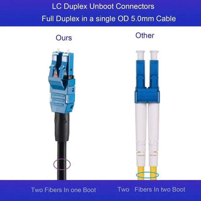 TPU JACKET LC FIBER CABLEThe fiber optic patch cable TPU jacket features strong tensile strength 500/800N, high abrasion resistance 2000/3000 N/100mm, waterproof, high and low-temperature resistance -40 to 176, UV-resistant, and bending resistance. ^^ LC UNIBOOT CONNECTORSUnibot fiber design allows one cable to carry two fibers, More space saving than traditional duplex cables, Ideal for high-density cabling application. Unibot lc to lc fiber patch cable also enable simplified polarity correction in the field without tool ^^ 5.0MM THICKER COREThis fiber patch cable with industry G. 657. A2 single mode fiber (compatible with G652D fiber) its outer diameter of 5.0 mm, which is thicker than 3.0 mm and can be used for frequent bending and hardware miniaturization.
