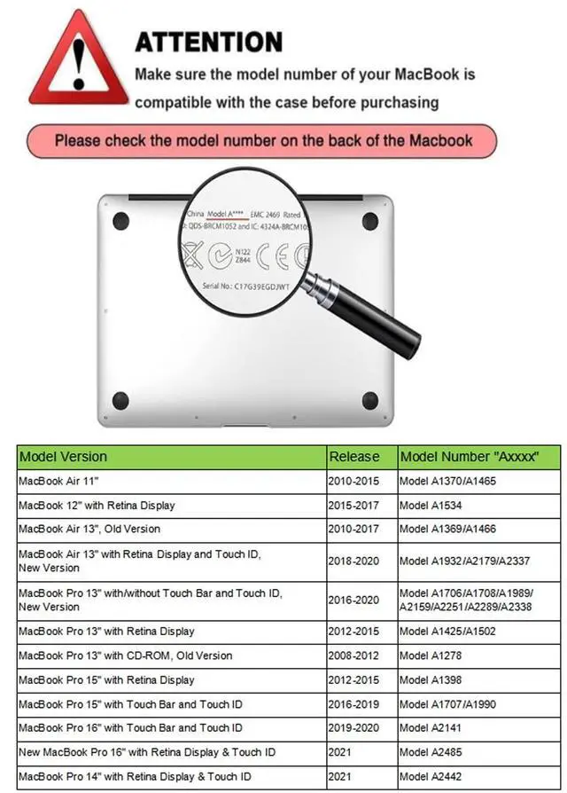 Case Only Compatible with: Model A1706/A1708/A1989/A2159/A2251/A2289/A2338 M1 (New Macbook Pro 13"/ 13.3" with/without touch bar and touch id, Release 2016-2020)We provided the model number location picture at the picture section. Please check your Macbook model "Axxxx" on the back of the laptop and order the correct model protective case.
